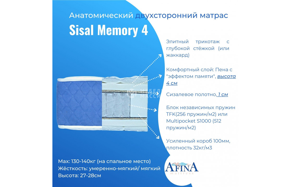 двусторонний Sisal Latex 3 / Sisal Memory 4 от фабрики афина с пружинным блоком tfk-256 (256 пружин на кв. метр) или multi-512 (512 пружин на кв. метр) на выбор. чехол жаккард стёганный 180-220 гр/м2 или элитный трикотаж с объёмной стёжкой 300гр/м2 на выбор. купите по цене производителя в интернет-магазине мебель массив.| Размер | Цена | |